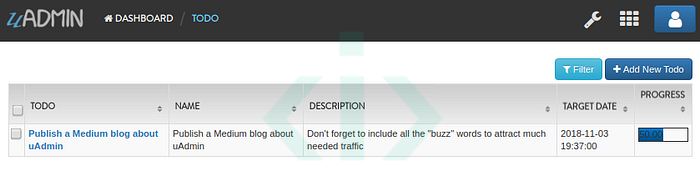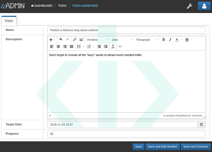 1package main 2 3import ( 4 "github.com/uadmin/uadmin" 5 "time" 6) 7 8type Todo struct { 9 uadmin.Model 10 Name string 11 Description string `uadmin:"html"` 12 TargetDate time.Time 13 Progress int `uadmin:"progress_bar"` 14} 15 16func main() { 17 uadmin.Register(Todo{}) 18 uadmin.StartServer() 19}